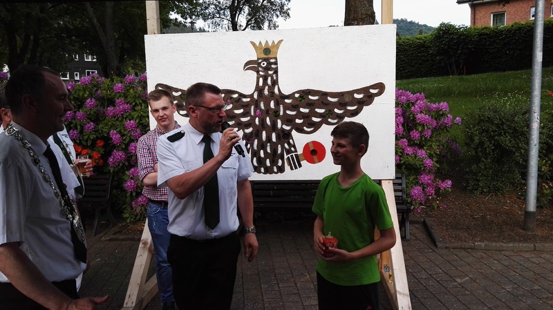 2 Stunden dauerte der Wettstreit um die Nachfolge des scheidenden Jungschützenkönigs Jan-Christian von der Heide, der ein Jahr lang die Jungschützen regierte. Eröffnet wurde das Schießen mit dem Ringen um die Ritterwürden. Nach nur 15 Schuss sicherte sich Felix Pöttner mit ruhiger Hand den Reichsapfel. 25 Minuten später jubelte Florian Wilke über eine Ritterwürde. Mit dem 60. Schuss schoss er dem Adler das Zepter aus der Kralle. Zum Schluss wurde auf die Krone gezielt. Tizian Virnich hatte das treffsicherste Auge und schoss mit dem insgesamt 71. Schuss die Krone ab. Nun war das Feuer auf den Vogel eröffnet. 11 Schützen waren noch im Rennen um die Königswürde. Diesmal zeigte sich der Adler sehr störrisch. Nach ca. 80 Schuss neigte sich der Adler nach rechts. Viele jubelten verfrüht denn der Vogel blieb im Kasten. Es dauerte weitere 50 Schuss ehe der Vogel endgültig zu Boden viel und Kevin Kruk der jubelnde Sieger war. Im Anschluss überreichte der scheidende Jungschützenkönig Jan-Christian von der Heide die Königskette an Bäckes Kevin und die Feier ging los.
