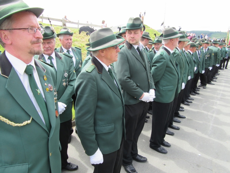 Am Morgen waren die Schützen angetreten, um ihren König Wilhelm Saure ein letztes Mal abzuholen. Nach dem traditionellen Schützenfrühstück beginnt um 11 Uhr hinter dem Besucherzentrum das Schießen um die Königswürde. Mit zwei Kleinkaliber-Gewehren legen die Aspiranten auf den in 35 Metern Entfernung auf einer Stange thronenden Holzvogel an.